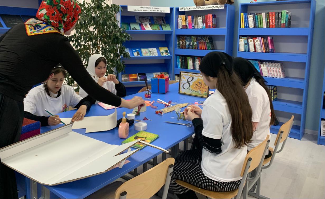 В рамках Республиканской ассоциации союзов читателей при Министерстве культуры ЧР, в Филиале №32, с. Мескеты ДБ, заведующая филиала провела с детьми мастер-класс международному женскому дню «Мы с мамочкой в рамочке».