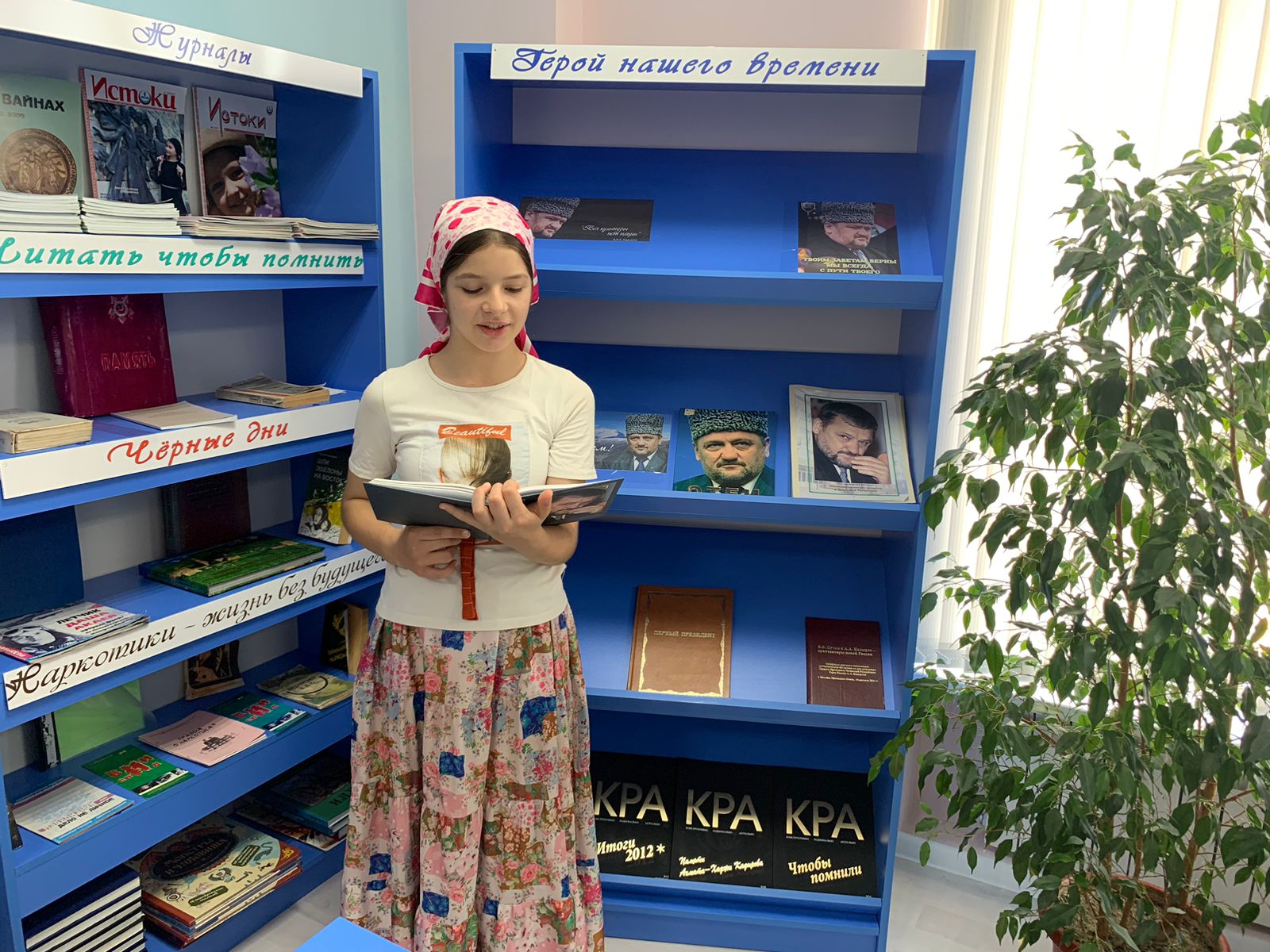 Слова А-Х. Кадырова «Я пришел не остановить войну, а покончить с нею навсегда», ставшие крылатыми, он воплотил в жизнь ценою своей жизни. Заведующий филиалом рассказала о трагической гибели великого человека Первого Президента ЧР, Героя России Ахмат–Хаджи Кадырова, а также отметила, что Ахмат–Хаджи Кадыров ценой своей жизни спас чеченский народ от войны и его сын Герой России, Глава ЧР Р.А. Кадыров продолжает путь своего отца. А также к мероприятию была оформлена книжная выставка «Герой нашего времени». Завершилось мероприятие чтением стихотворений, посвященных Первому Президенту Чеченской Республики, Герою России Ахмат-Хаджи Кадырову «Отчизной жил он…». Охват-14 человек.