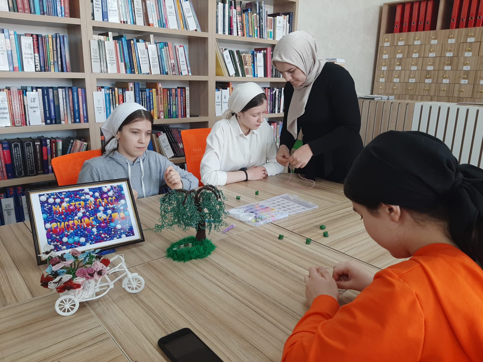 Библиотекарь Сунчханова Линда Салмановна познакомила ребят с историей возникновения бисера, рассказала из каких материалов он производится. Для занятия использовали: бисер, проволока, леска, нитки мулине или ирис, иголка, ножницы. Были представлены различные журналы и книги из фонда, где можно было рассмотреть интересные схемы плетения бисером. Охват-40 человек.