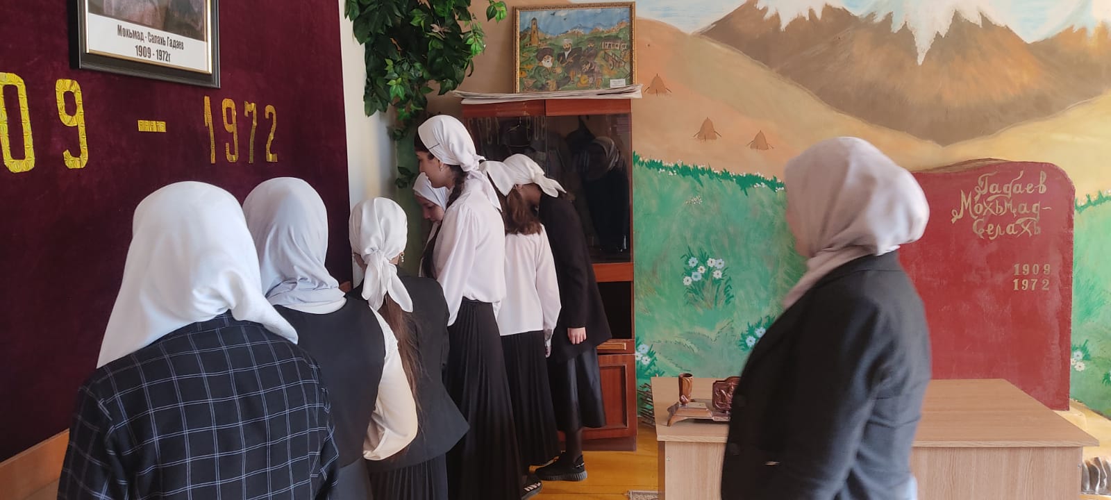 В ходе экскурсии заведующая рассказала детям о жизни и творчестве М-С Гадаева. Также ребята узнали, что родился Магомед-Салах Гадаев в селе Чурчу-Ирзу 6 декабря 1909 года. В 1924 году его семья переехала в село Нижний Герзель, где он окончил четыре класса начальной сельской школы. В 1928 году поступил на рабфак в Ростове-на-Дону, где начинал литературную и научную деятельность. М-С. Гадаев занимался переводом на чеченский язык произведений Лермонтова, Толстого, Пушкина, Некрасова, Шевченко. В это время вышли в свет его романы «Два человека» и «Ночной всадник», повести «Невестка», «Грузин» и «Дикость», рассказы «Хазман», «Друзья» и др. И в 1940 году публикует поэтический сборник «Стихи» и т. д.